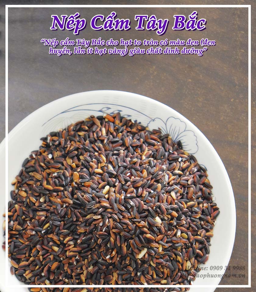 Đây là loại nếp cẩm nguyên bản, được trồng lâu đời tại các vùng núi phía Bắc Việt Nam. Hạt gạo có màu tím đen hoặc đỏ sẫm, lớp cám dày, hàm lượng Anthocyanin cao. Khi nấu chín, cơm có màu tím đậm tự nhiên, mùi thơm sâu và vị dẻo bùi rõ rệt. Đây là dòng gạo có giá trị dinh dưỡng cao nhất, thường được dùng trong thực dưỡng và chế biến rượu nếp cẩm truyền thống.