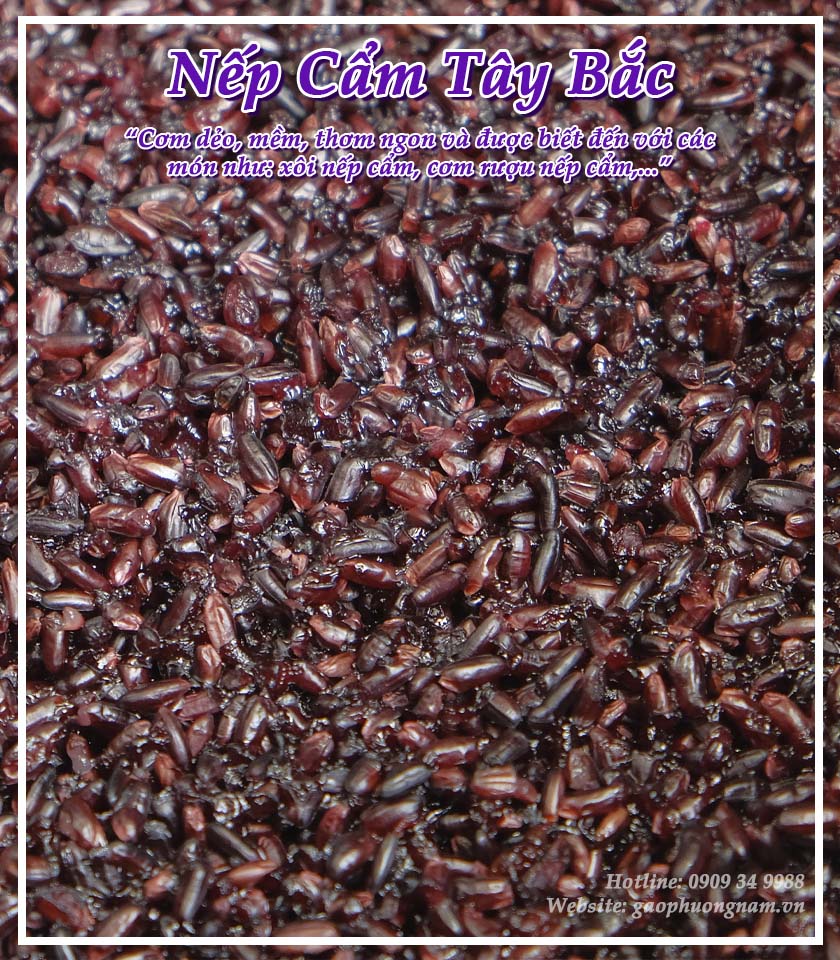 Đây là loại nếp cẩm nguyên bản, được trồng lâu đời tại các vùng núi phía Bắc Việt Nam. Hạt gạo có màu tím đen hoặc đỏ sẫm, lớp cám dày, hàm lượng Anthocyanin cao. Khi nấu chín, cơm có màu tím đậm tự nhiên, mùi thơm sâu và vị dẻo bùi rõ rệt. Đây là dòng gạo có giá trị dinh dưỡng cao nhất, thường được dùng trong thực dưỡng và chế biến rượu nếp cẩm truyền thống.